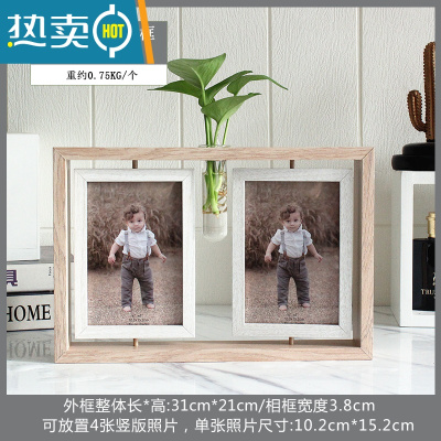 敬平创意双面相框摆台北欧木质6寸连体旋转水培相架多张组合照片像框 A款双联框带水培原木色 相框+打印照片