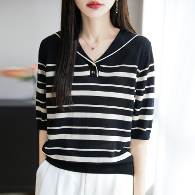 高品质天丝莱赛尔针织短袖女海军领条纹撞色翻领气质百搭上衣