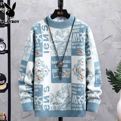 花花公子圆领毛衣男士秋冬季新款宽松衣服潮牌拼色休闲内搭针织衫