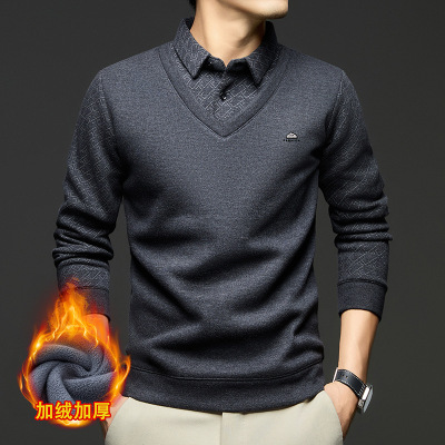 含羊毛假两件男士毛衣爸爸装秋冬季新款加绒保暖翻领打底针织衫男