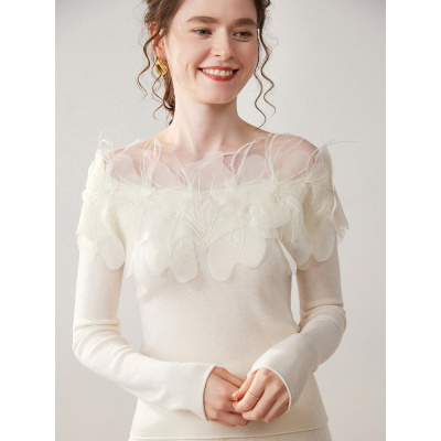 新款山羊绒针织衫女立体花朵一字肩长袖套头内搭时尚休闲打底毛衣