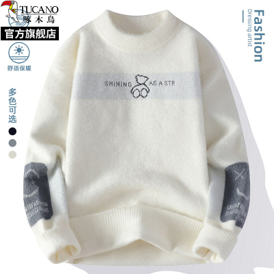 啄木鸟2024秋冬季新款圆领一体绒毛衣男士大码打底针织衫保暖线衣