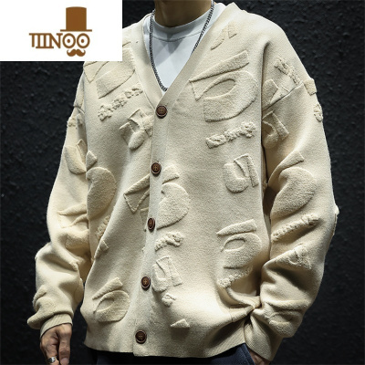 YANXU2023男士新款休闲植绒开衫毛衣青少年潮牌V领针织衫外套潮