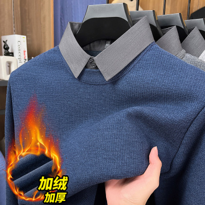 含羊毛华夫格加绒假两件毛衣男秋冬新款550g翻领打底针织衫男