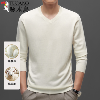 啄木鸟春季新款桑蚕丝打底针织衫纯白色羊毛V领套头内搭薄毛衣男
