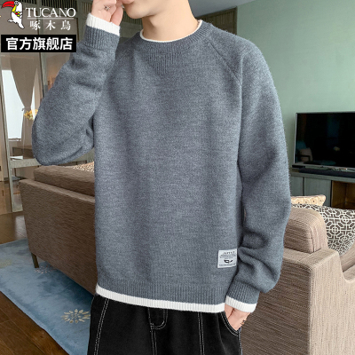 啄木鸟2024秋冬季新款假两件圆领撞色毛衣男加绒打底针织衫线衣服