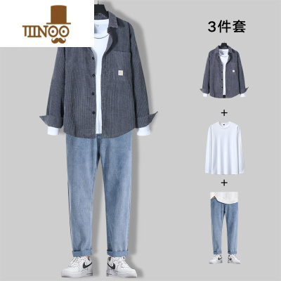 YANXU秋季衬衫男长袖日系休闲套装韩版潮流灯芯绒衬衣男装穿搭一套