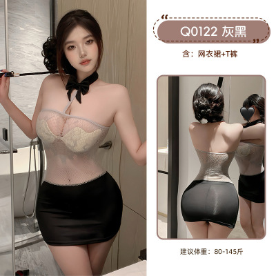 九里晴川拼色连衣裙性感风挂脖抹胸透肤蕾丝露背网纱透视情趣睡裙 九里晴川Q0122[拼接连衣裙-黑灰] 均码