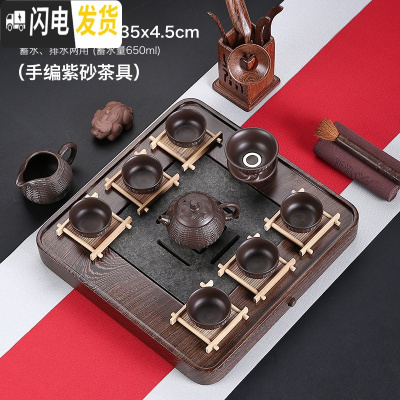 三维工匠鸡翅木茶盘实木紫砂茶壶功夫茶具套装家用储蓄排水简约茶台整套 套装九:四方空念茶盘-手编紫砂茶具 21件