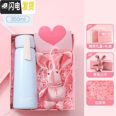 三维工匠保温杯子女学生便携水杯韩国清新可爱个性创意潮流不锈钢简约水瓶 [一盖两用☆礼盒装]樱花粉-350