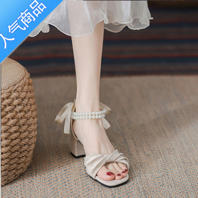 SUNTEK2023夏季新款粗跟凉鞋女中跟时装一字带高跟鞋女蝴蝶结绑带珍珠鞋