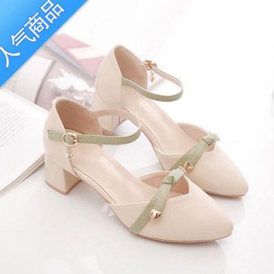 SUNTEK2023早春新款包头单鞋女中跟一字扣高跟鞋粗跟尖头配裙子凉鞋百搭