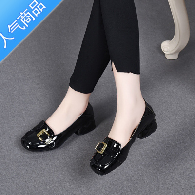 SUNTEK2023春季新款韩版百搭网红粗跟尖头高跟鞋浅口漆皮上班单鞋女中跟