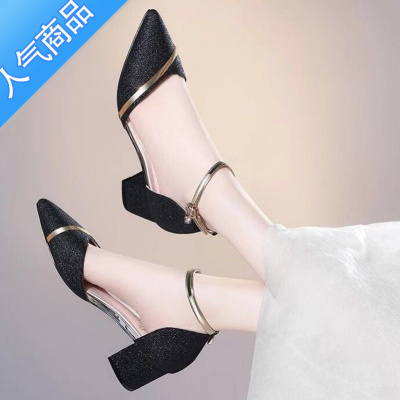 SUNTEK单鞋2021新款包头凉鞋女夏百搭粗跟夏季一字扣夏款伴娘高跟鞋中跟