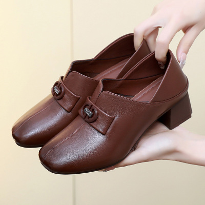 聚范软皮软底单鞋2024新款百搭中跟皮鞋女款妈妈鞋大码乐福鞋