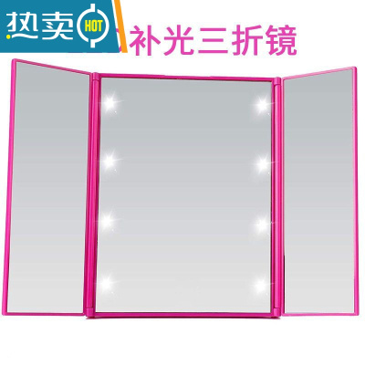 敬平LED三折镜 带灯折叠梳妆镜子LED化妆镜台式收纳便携镜子三面镜 玫红色带灯便携式用镜