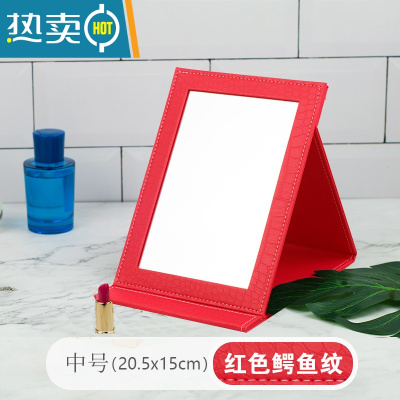 敬平高清PU皮革台式学生女生宿舍公主梳妆便携随身折叠化妆镜子大小号 中号 红色鳄鱼纹(镜面加厚)便携式用镜