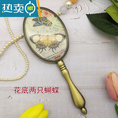 敬平欧式复古青铜金属手柄镜子女化妆镜小号便携随身少女公主圆手持镜 花底两只蝴蝶便携式用镜
