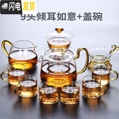 三维工匠玻璃茶具功夫茶杯套装家用简约透明办公室会客泡茶壶客厅小套泡茶 9头倾耳如意+盖碗