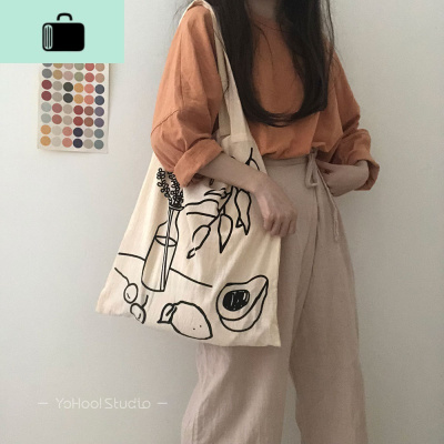 日系慵懒风~ ins简约线条百搭薄款单肩棉麻包帆布购物袋女NEW LAKE 线条画(薄薄的棉布面料)女士单肩包