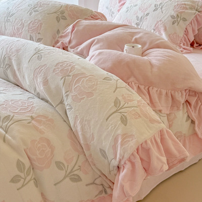 a类花牛奶绒四件套花边珊瑚绒被套冬季加绒床上用品法兰绒床单