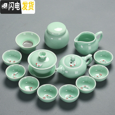三维工匠青瓷功夫茶具家用套装盖碗茶壶鱼杯茶洗陶瓷整套工夫茶具简约个性 5青瓷14头碗壶洗安全包装鱼杯