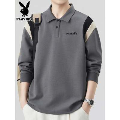 花花公子翻领长袖t恤男士上衣秋季新款高级感撞色休闲Polo衫男装