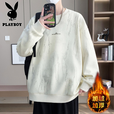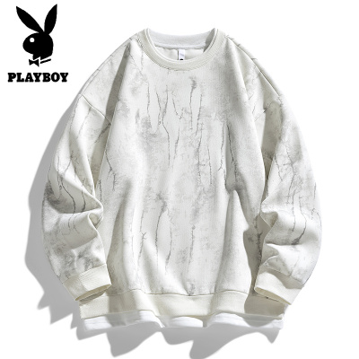 花花公子新款高品质加绒重磅圆领卫衣男2025秋冬新款假两件拼接扎染宽松休闲上衣