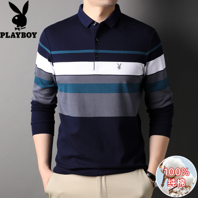 花花公子2024秋季新款纯棉长袖T恤男中年爸爸商务休闲条纹POLO衫