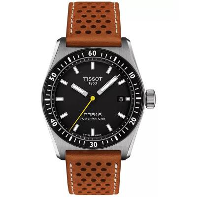 天梭(TISSOT)瑞士自动机械表男表银色日历窗不锈钢表壳棕色打孔皮带防水100米