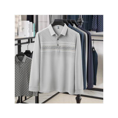 秋季新款Polo衫印花宽松中年男士长袖翻领T恤衫条纹衬衫领爸爸装