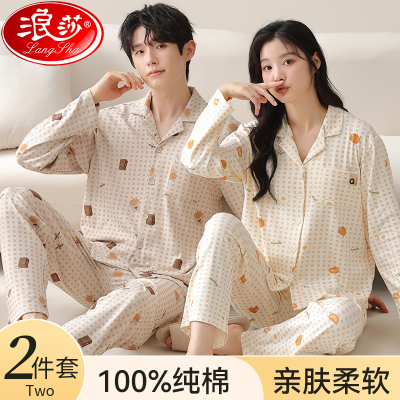 浪莎女士睡衣春秋季新款情侣纯棉长袖长裤套装男家居服秋冬款全棉