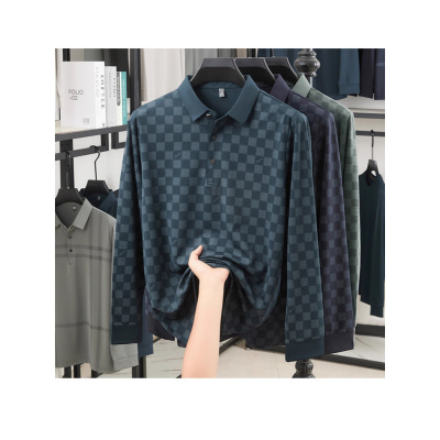 男士春秋长袖polo衫中年休闲衬衣领宽松立体格子T恤男装半袖上衣