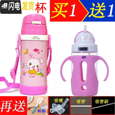 三维工匠婴儿吸管保温杯手柄不锈钢儿童吸管水杯防漏夏季宝宝水壶背带水瓶 粉色背带400