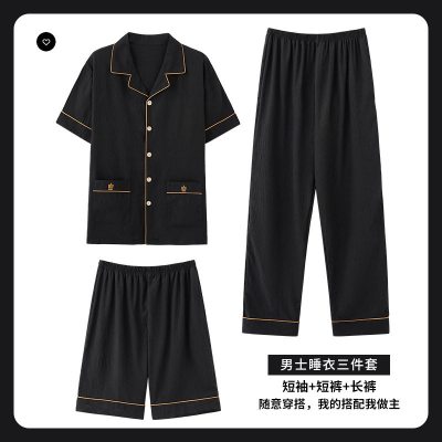 纯棉睡衣男士夏季短袖长裤三件套休闲可外穿全棉家居服男套装