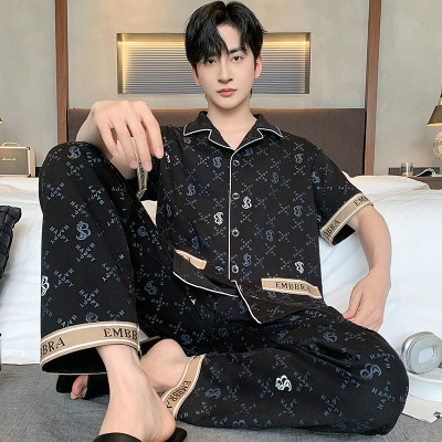 2026新款睡衣男士夏季棉质短袖长裤薄款休闲男式开衫家居服两件套