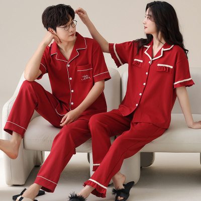 大红色睡衣结婚新婚情侣开衫春夏季短袖长裤男女特大码家居服套装