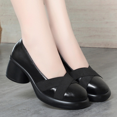 深口女鞋春秋新款厚底坡跟单鞋女舒适粗跟软底中老年皮鞋妈妈鞋子