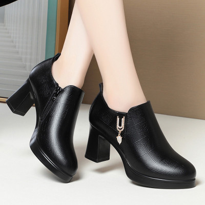 深口单鞋女春秋新款高跟鞋粗跟加绒防水台厚底不累脚中年女士皮鞋