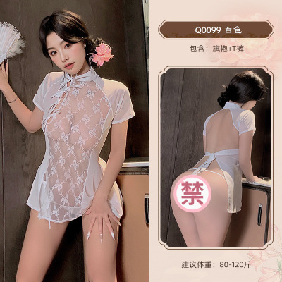 长夜漫漫情趣内衣性感火辣镂空蕾丝诱惑激情旗袍古风制服套装镂空复古国风旗袍开叉露背睡裙情趣丁字裤套装蕾丝旗袍80-125斤