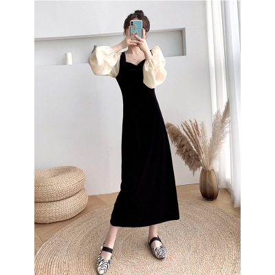 丝绒连衣裙长袖法式复古气质收腰显瘦方领泡泡袖中长款裙子秋装潮