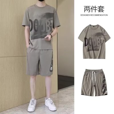 冰丝短袖T恤男士夏季新款韩版青年半袖字母运动休闲套装