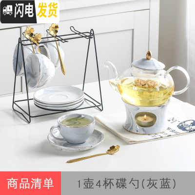 三维工匠欧式ins下午茶陶瓷花茶壶玻璃花水果花果茶具耐热蜡烛加热套装 1壶4杯碟(灰蓝)送铁架勺子蜡烛