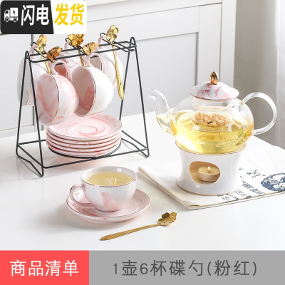 三维工匠欧式ins下午茶陶瓷花茶壶玻璃花水果花果茶具耐热蜡烛加热套装 1壶6杯碟(粉红)送铁架勺子蜡烛