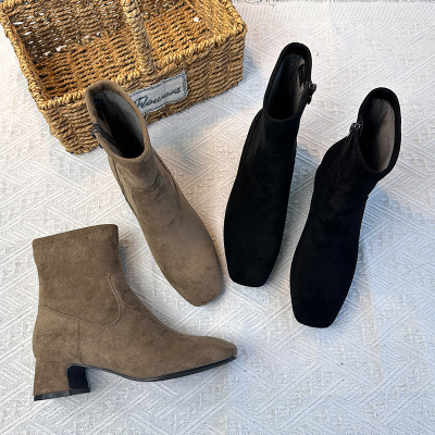 粗跟短靴女冬季新款加绒马丁靴女方头袜靴时装百搭弹力靴子女