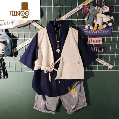 YANXU短袖衬衫短裤套装男感日系港风复古工装外套潮牌痞帅炸街衬衣