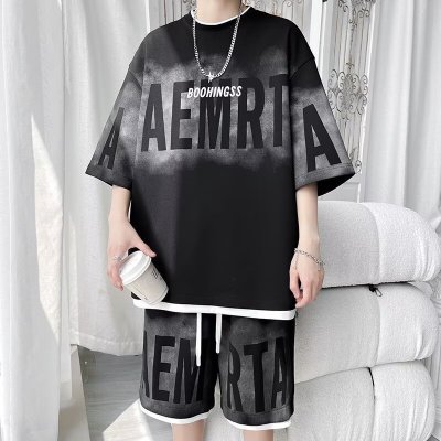 夏季新款男士渐变色潮流休闲青年运动时尚短裤两件套