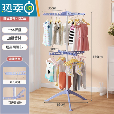 敬平婴儿晾衣架落地折叠多功能晒衣器新生儿童衣架宝宝尿布架毛巾架 [双层款蓝色]金属款-双层7翅防风-可旋转升降 大