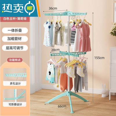 敬平婴儿晾衣架落地折叠多功能晒衣器新生儿童衣架宝宝尿布架毛巾架 [双层款绿色]金属款-双层7翅防风-可旋转升降 大