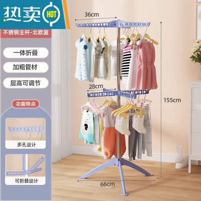 敬平婴儿晾衣架落地折叠多功能晒衣器新生儿童衣架宝宝尿布架毛巾架 [双层款蓝色]不锈钢-双层7翅防风-可旋转升降 大